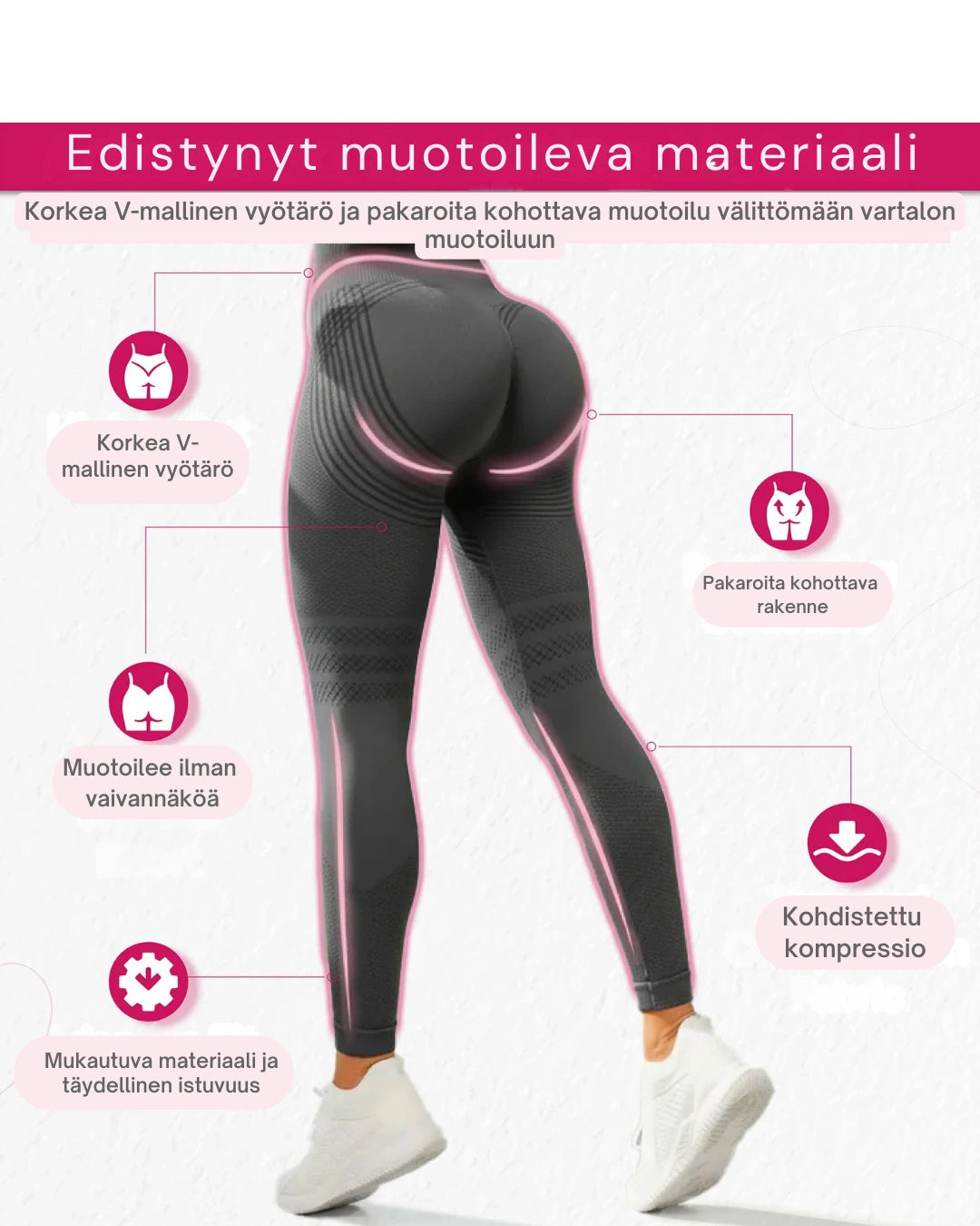 Huomaat eron jo leggingsit jalkaan pukiessasi. Säännöllisessä käytössä siluetti näyttää tasaisemmalta ja selkeämmältä, ja mukavuus säilyy koko päivän.